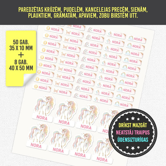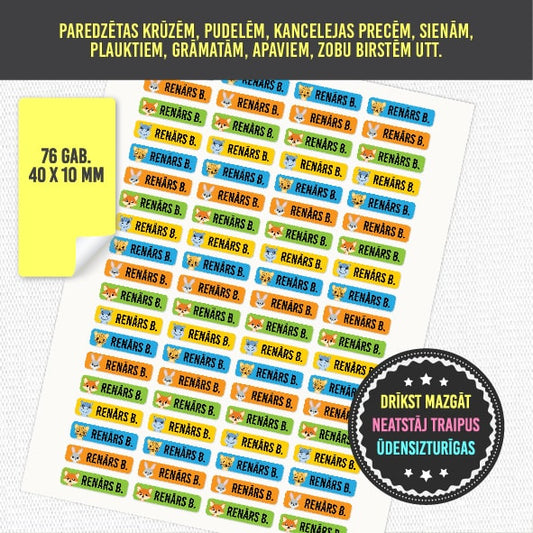 Ūdensizturīgas uzlīmes ar vārdu un dzīvniekiem